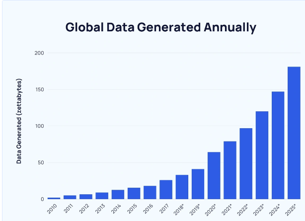 De acuerdo a este gráfico publicado por Exploding Topics (2024), en el año 2015 se generaron 15,5 zetabytes de datos en todo el mundo, en el año 2020 64,2 zetabytes y la proyección para el 2025 es de 181 zetabytes. Es decir, que en solo 10 años (entre 2015 y 2025) se proyecta un aumento de un 1067% (aprox) en la generación de datos a nivel global. Suena una cifra casi irreal, pero los números la avalan.